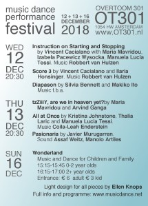 Music Dance Performance Series is an artist run project that presents interdisciplinary performance works in Amsterdam. It takes place at cultural centre OT301 as its main base as well as other Amsterdam venues.